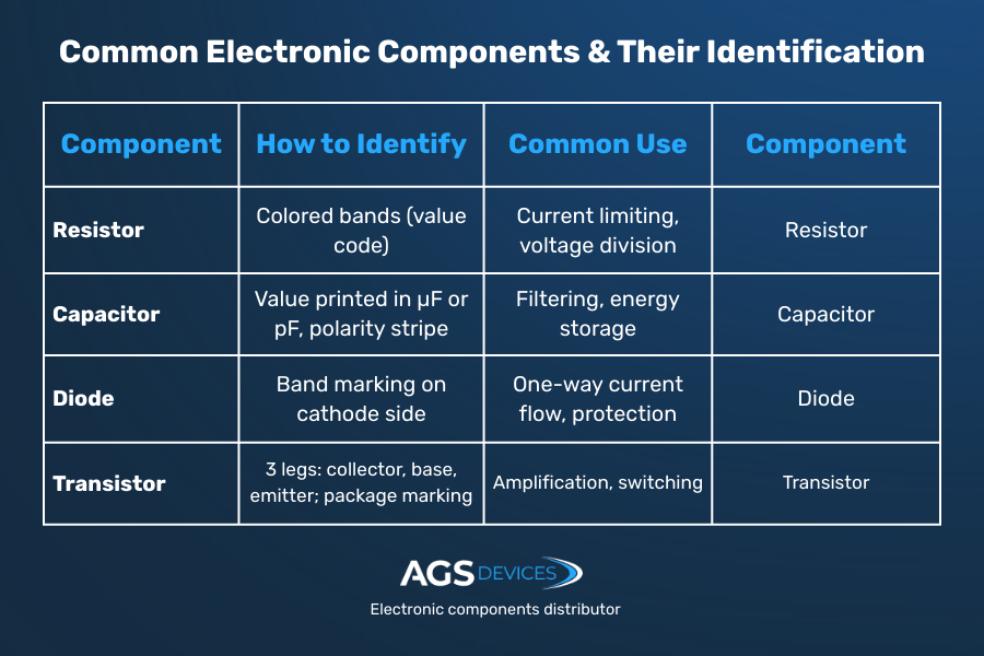 - Manufacturer logos & part numbers: ICs, transistors, and diodes typically have engraved or printed alphanumeric codes that match datasheets.