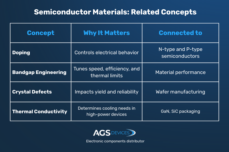 - Bandgap, mobility, and thermal behavior determine how a semiconductor performs and why material selection is never one-size-fits-all
