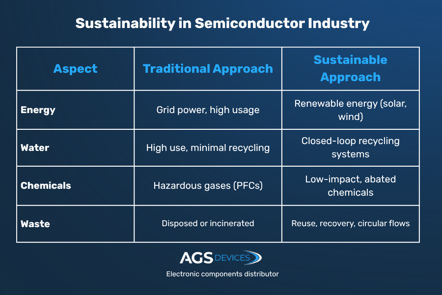 A side-by-side look at how semiconductor manufacturing is evolving, from traditional, resource-heavy methods to more sustainable, efficient, and traceable practices